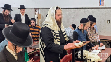די גרעסערע קינדער פון תלמוד תורה אין שטעטל ביים זאגן סליחות אין ביהמ"ד אויף האשקי - ג' האזינו תשפ"ו